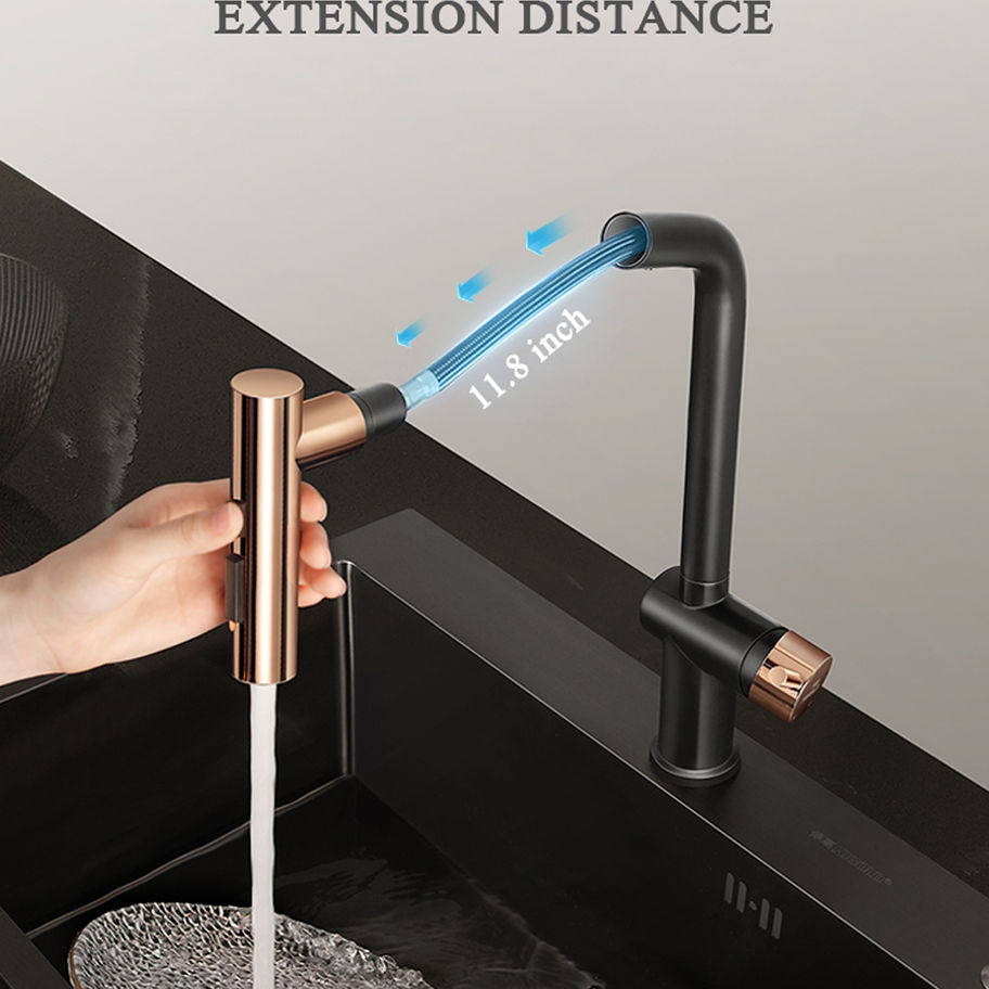 Higold BN1.0 Rose Gold Tri-functional Kitchen faucet with pull down sprayer, resists rust, corrosion, and stylish simplicity, highlighting the kitchen style. Helps you easy to clean every corner of sink.